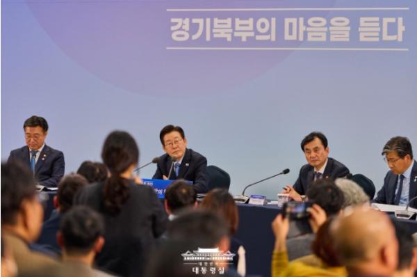 이에 이 대통령은 "오늘은 이 문제를 어떻게 해결할지부터 포함해, 앞으로 경기북부가 어떻게 잘 발전할 수 있을지 여러분들의 지적과 제안도 들어보고 관련 부처의 의견도 들어보는 시간을 가지겠다"고 밝혔다.