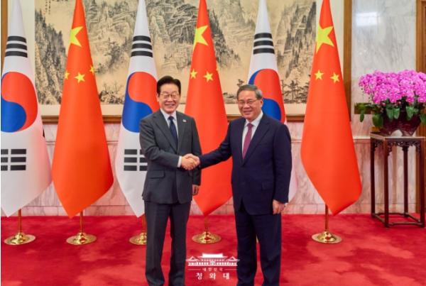 아울러 이 과정에서 외교채널뿐 아니라 안보·국방 분야에서도 필요한 교류와 소통을 이어나가자고 했다. 이 대통령은 한중일 협력의 틀 속에서도 관련 논의를 이어가며 리 총리와 다시 만나 의견을 교환할 수 있길 기대한다고 했다.